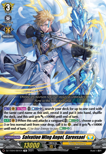 With "Salvation Wing Angel, Sarevsael" we are looking at multi attacking, but this time we are using our drop zone, somewhat similar to the upcoming "Fated One of Miracles, Rezael". Unlike Rezael though, what we call is not restrcted to how our damage is, and we actually gain power off of it as well, but at the cost of only being able to call one card instead of up to two. Due to their similarities though, it does mean Sarevsael is going to be getting cards that work well with him regurlarly, which is good for a Quick Start Deck boss. But for now, let us take a look at a sample list to see what we can work with now.